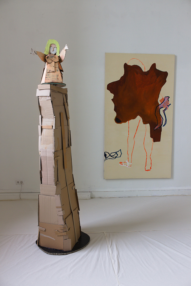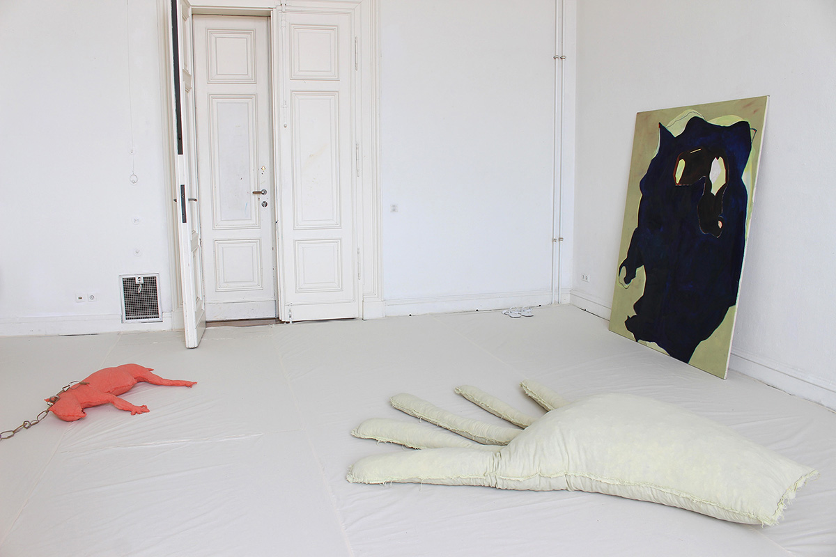 In meinen Rauminstallationen kombiniere ich Malerei, Performance, Zeichnungen und Figuren aus Stoff und Pappe, mit denen ich menschliche Zustände beschreibe. Sie behandeln das Ausloten von Ambivalenzen wie Aktivität und Passivität, Macht und Ohnmacht oder Rückzug und Selbstermächtigung in einer komplexen Welt.